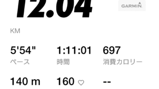 距離:12.04km時間:1:11:01平均ペース:5'54/kmひとこと:公園の周回コースで距離を稼ぐ。最速5km&10km達成。